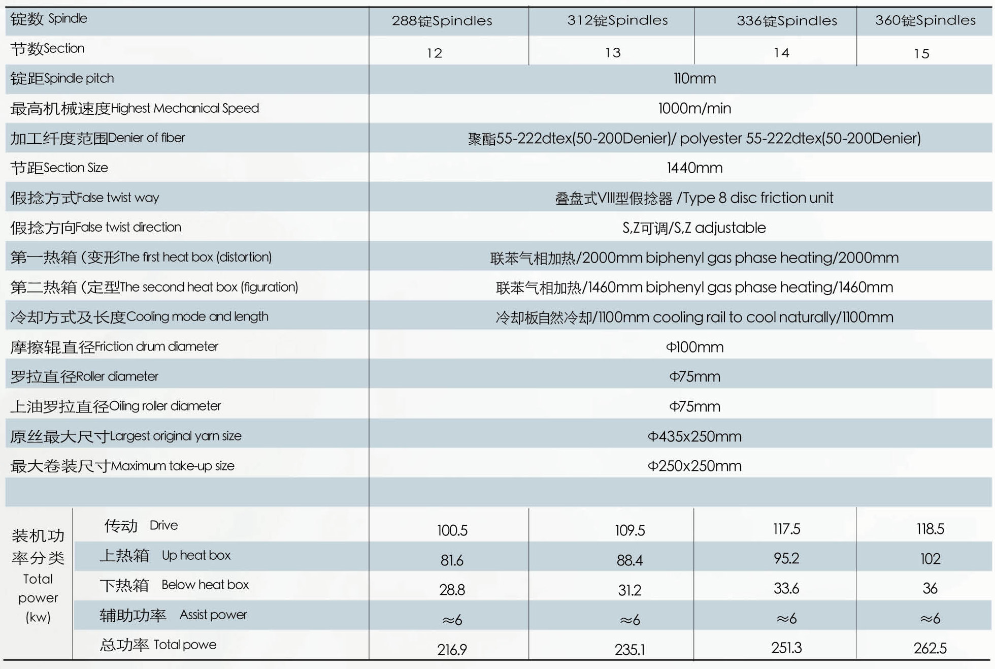 【設(shè)備用途Equipment use】 該機(jī)主要是將POY原絲(聚酯預(yù)取向絲),通過拉伸和假捻變形加工成具有低彈性能的假捻變形絲(DTY滌綸彈力絲),加工時(shí)在每個(gè)錠位將S捻和Z捻的雙絲合股直接一步加工...