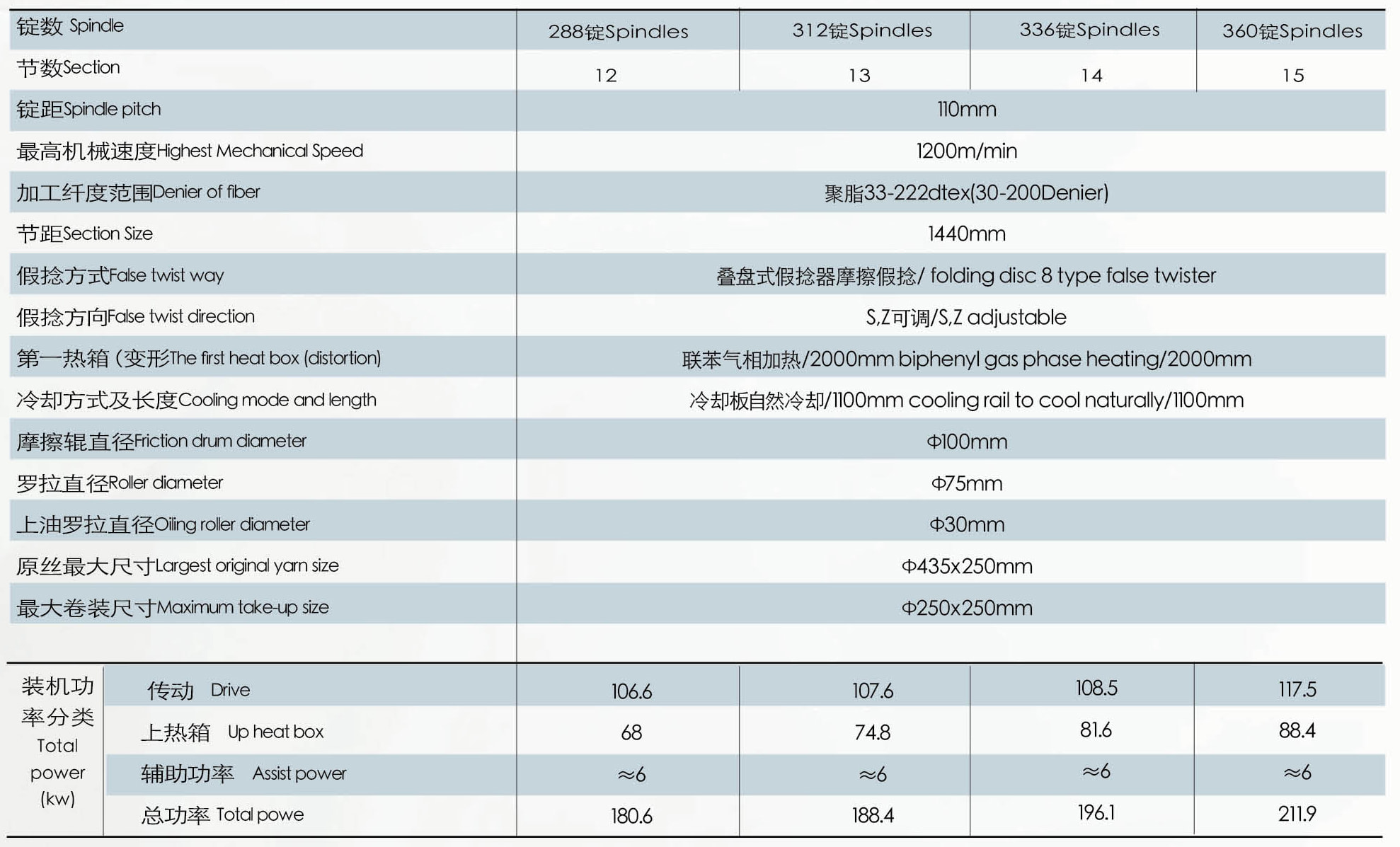 【設(shè)備用途Equipment use】 該機(jī)主要是將POY原絲(聚酯預(yù)取向絲),通過(guò)拉伸和假捻變形加工成具有低彈性能的假捻變形絲(DTY滌綸彈力絲),加工時(shí)在每個(gè)錠位將S捻和Z捻的雙絲合股直接一步加工...