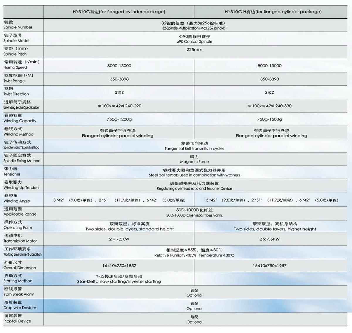 【主要特點】 HY310G高速超細化纖倍捻機是浙江省高新技術產品。它具有錠速高,加捻范圍廣、能耗低等優點,可加捻20旦尼爾的超細化纖絲,符合紡織行業發展的需求。